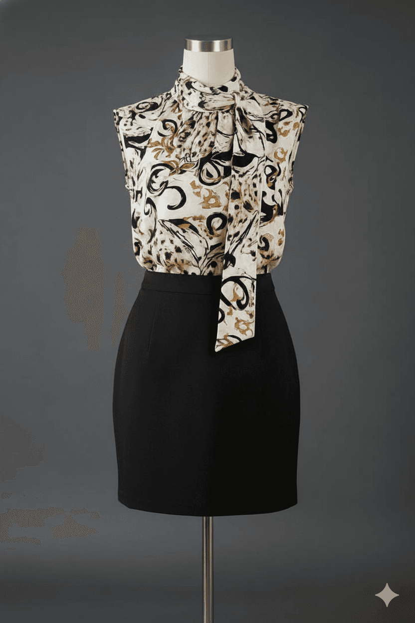 This bold printed top with scarf-inspired patterns is a statement piece on its own. Pair it with solid-colored bottoms like black trousers, beige culottes, or a pencil skirt to balance the busy design. For a chic look, tuck it into high-waisted pants and add heels or loafers. Minimal jewelry works best—opt for studs or a sleek watch. A structured handbag in a neutral shade will tie the outfit together, letting the print remain the highlight.