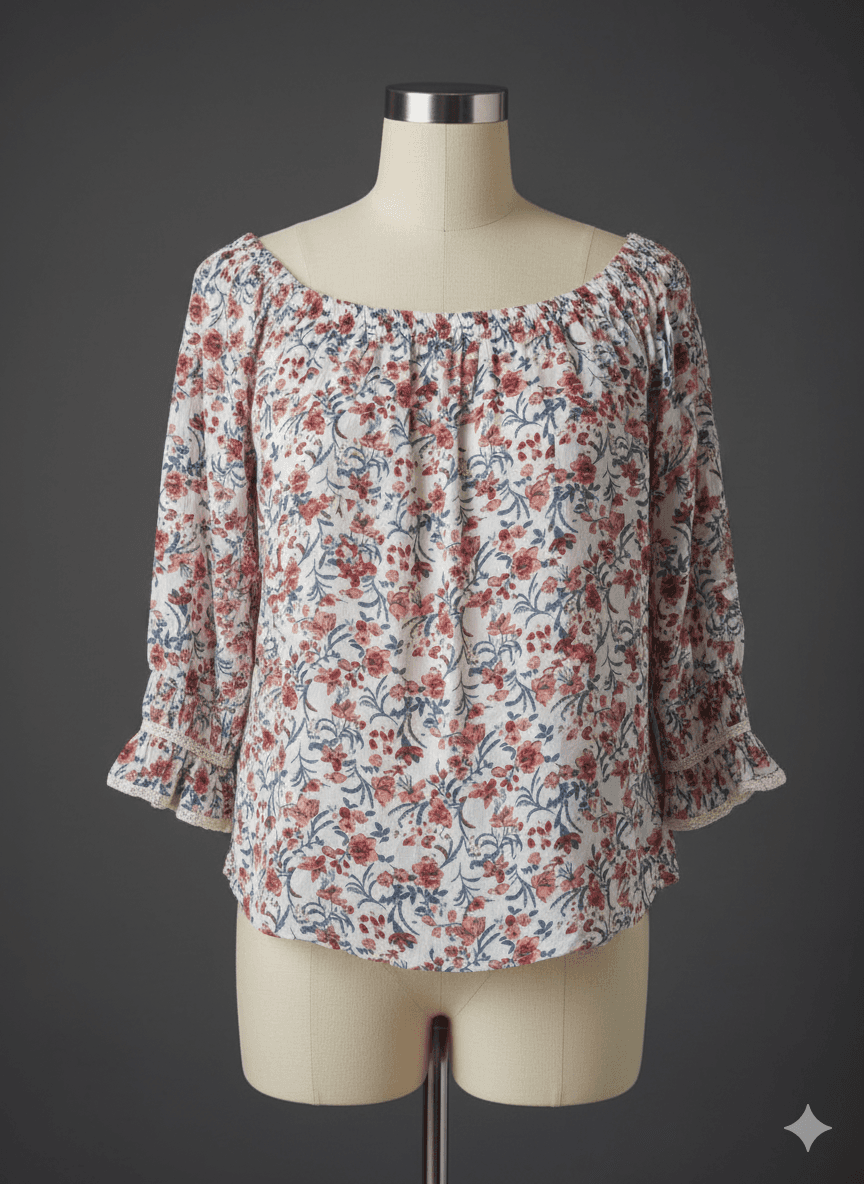 This floral off-shoulder top is perfect for a breezy, feminine look. Pair it with high-waisted jeans or a denim skirt for a casual outing, or tuck it into tailored trousers for a chic day look. Keep accessories minimal with dainty earrings or a layered necklace to highlight the neckline. For footwear, opt for strappy sandals in summer or ankle boots for a transitional vibe. A crossbody bag or a tote will complete the effortless style.