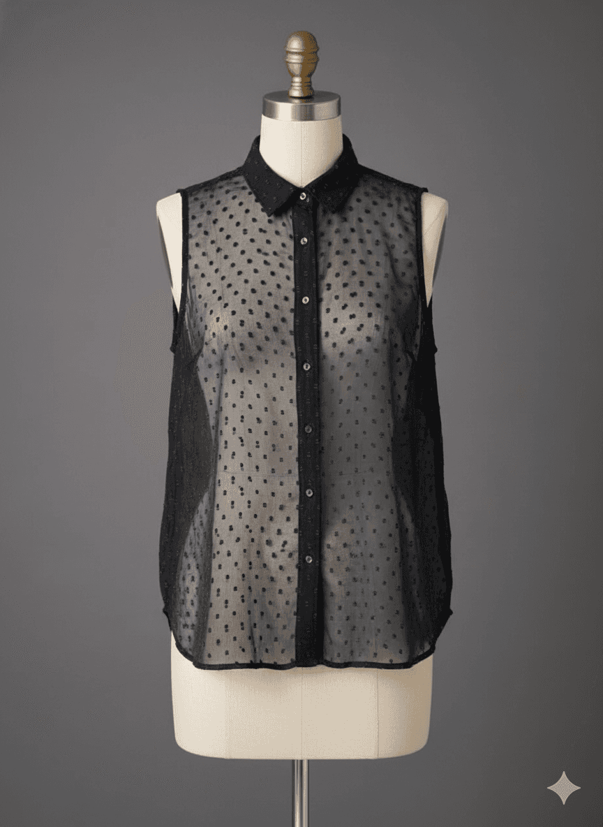 The Shadow Dot Sleeveless Shirt from H&M brings subtle sophistication with its sheer black fabric and delicate textured dot pattern. Lightweight and breathable, it features a pointed collar and full front button closure, perfect for both workwear layering and evening outings. Pair it with a midi skirt or tailored pants for a sleek monochrome look, or wear it under a blazer for added polish. To care, machine wash cold in a gentle cycle using a laundry bag, hang to dry, and iron on low heat if needed, preferably on the reverse side to maintain its sheer elegance.