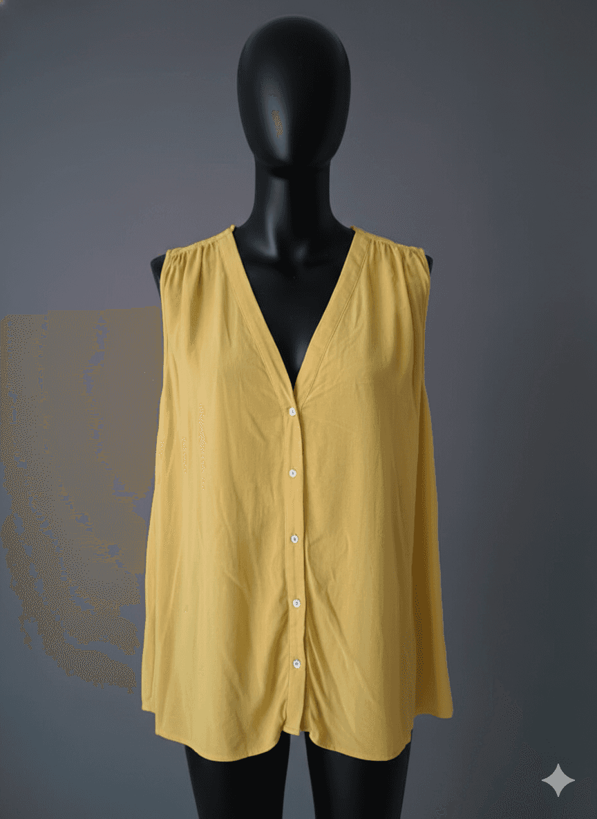 The Sunbeam Button-Front Blouse from H&M is a breezy summer essential, designed in a cheerful golden-yellow hue that brings instant warmth to your wardrobe. Crafted from a lightweight viscose blend, it features a soft drape, sleeveless cut, and gentle gathers at the shoulders for a relaxed, feminine silhouette. Style it tucked into a neutral A-line skirt or pair it with wide-leg trousers for a laid-back yet polished look. To care for this blouse, machine wash cold on a gentle cycle, avoid bleach, and hang to dry to preserve its vibrant color and fluid feel.