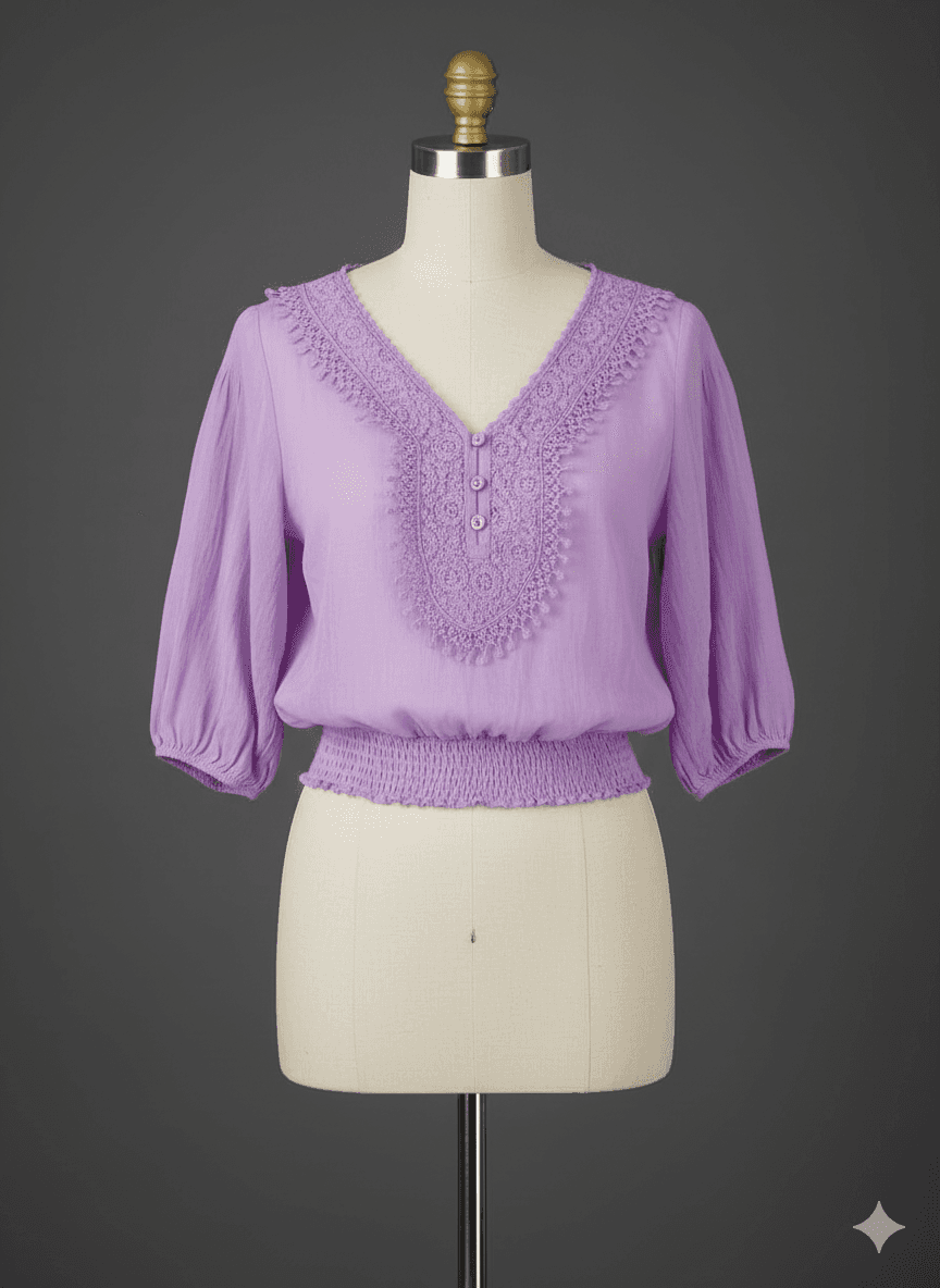 This delicate lavender top with lace detailing is perfect for a soft and feminine look. Pair it with white or pastel trousers for a fresh summer vibe, or tuck it into a flowy skirt for a more dressed-up feel. Keep accessories minimal with pearl earrings or a dainty bracelet to let the lace neckline stand out. Complete the outfit with nude flats or strappy sandals and a small sling bag for a graceful, effortless style.