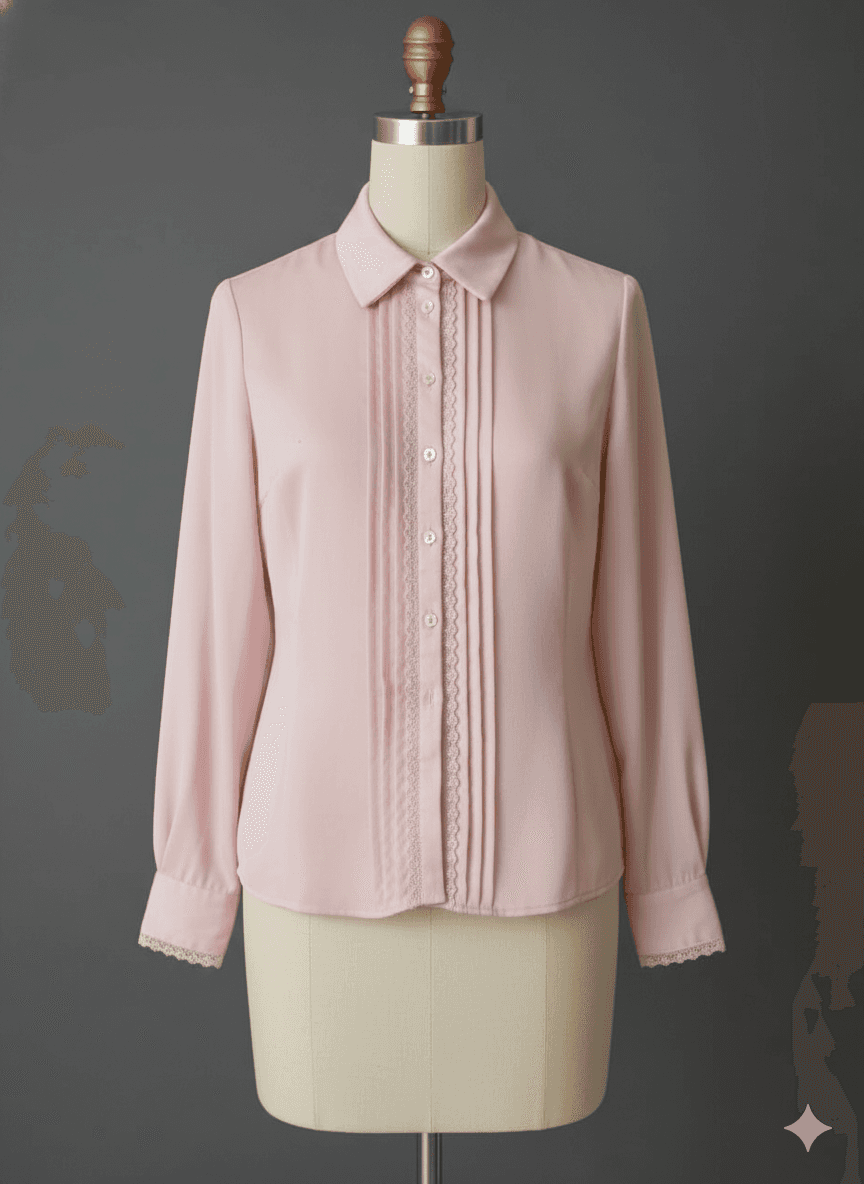 This soft pink button-down shirt with lace and pleat details adds a romantic twist to a classic style. Pair it with tailored trousers or a pencil skirt for a feminine office look, or dress it down with light-wash jeans for a chic casual outfit. Keep accessories subtle—pearl earrings or a delicate chain will complement the lace beautifully. Finish with nude pumps or ballet flats and a structured handbag for a polished touch.