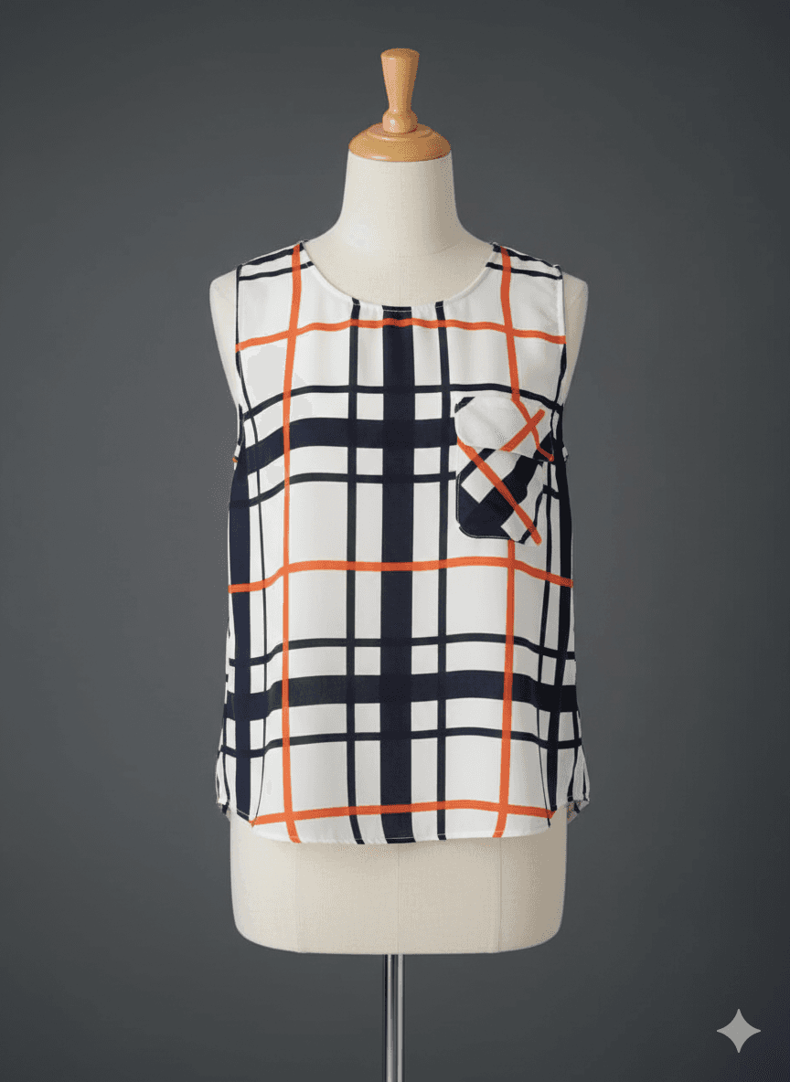 The Metro Grid Sleeveless Blouse by Zara brings a bold, modern edge with its striking geometric check print in black and orange against a clean white backdrop. Crafted from a smooth, lightweight poly-blend fabric, it drapes effortlessly for both office polish and casual versatility. Pair it with high-waisted trousers or a statement skirt for a pop of contemporary chic. For care, machine wash cold on a delicate cycle, avoid harsh detergents or bleach, and hang to dry. Light steaming is recommended to maintain its crisp, structured look.